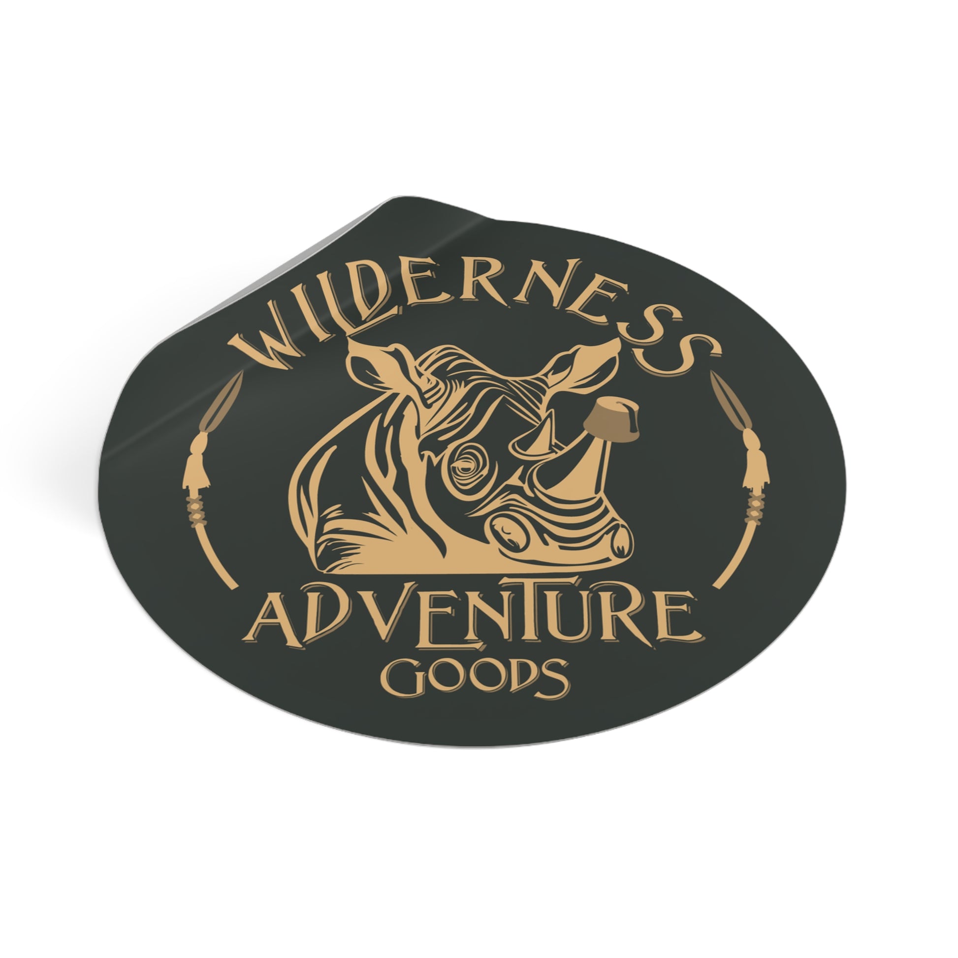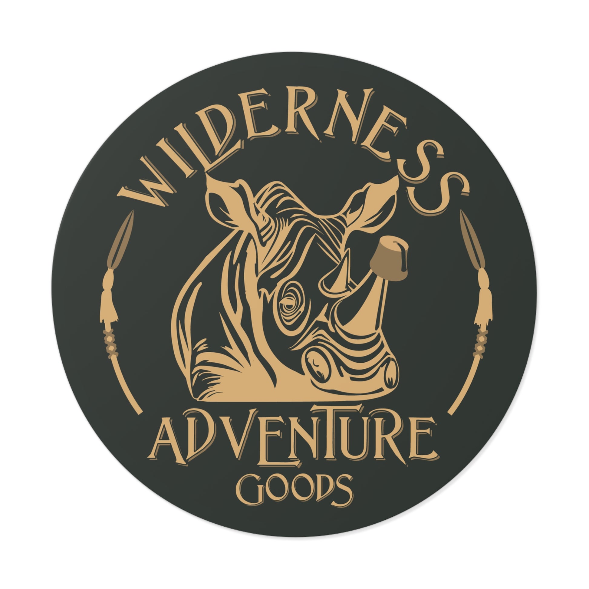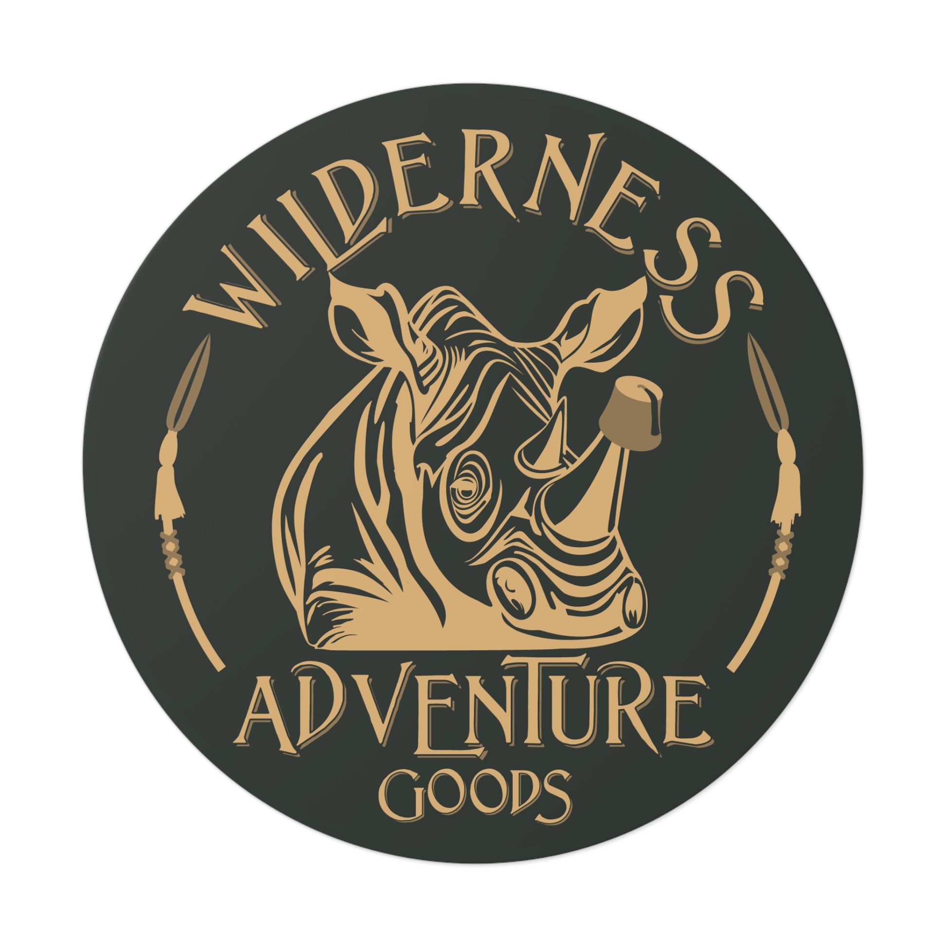 Bring a little Adventureland spirit wherever you go with this bold, durable round vinyl sticker featuring the official Wilderness Adventure Goods logo. Designed with a sleek black background and gold lettering, this sticker showcases two curved ceremonial spears framing a charging rhino wearing a fez—a playful nod to the wild, whimsical world that inspires all our creations.